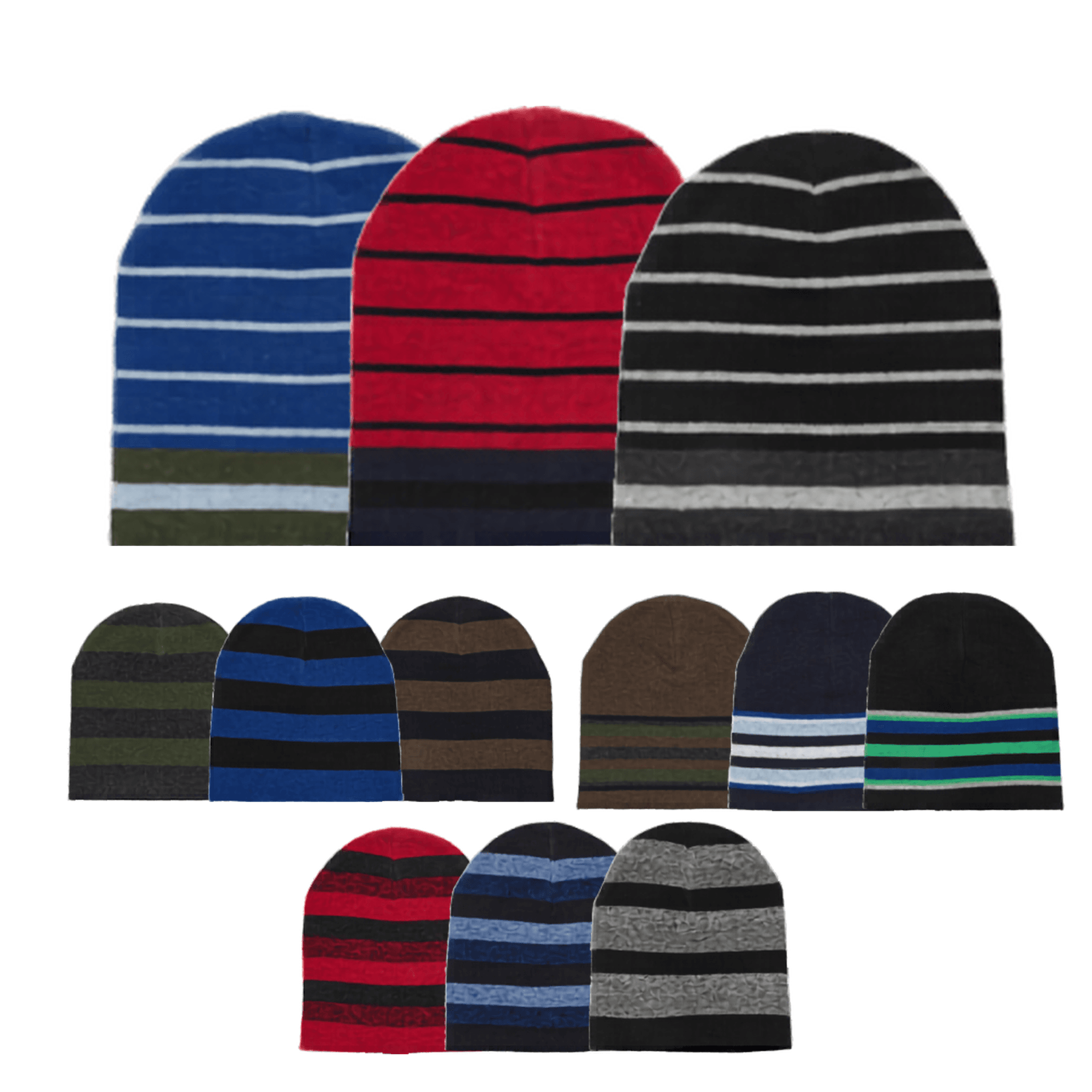 These men’s striped winter hats offer a soft, stretch-knit feel with a comfortable, flexible fit for everyday cold-weather wear. Designed with a variety of classic stripe patterns and versatile color combinations, they are perfect for seasonal styling and easy to merchandise across a wide range of customers. Available in assorted dozens.