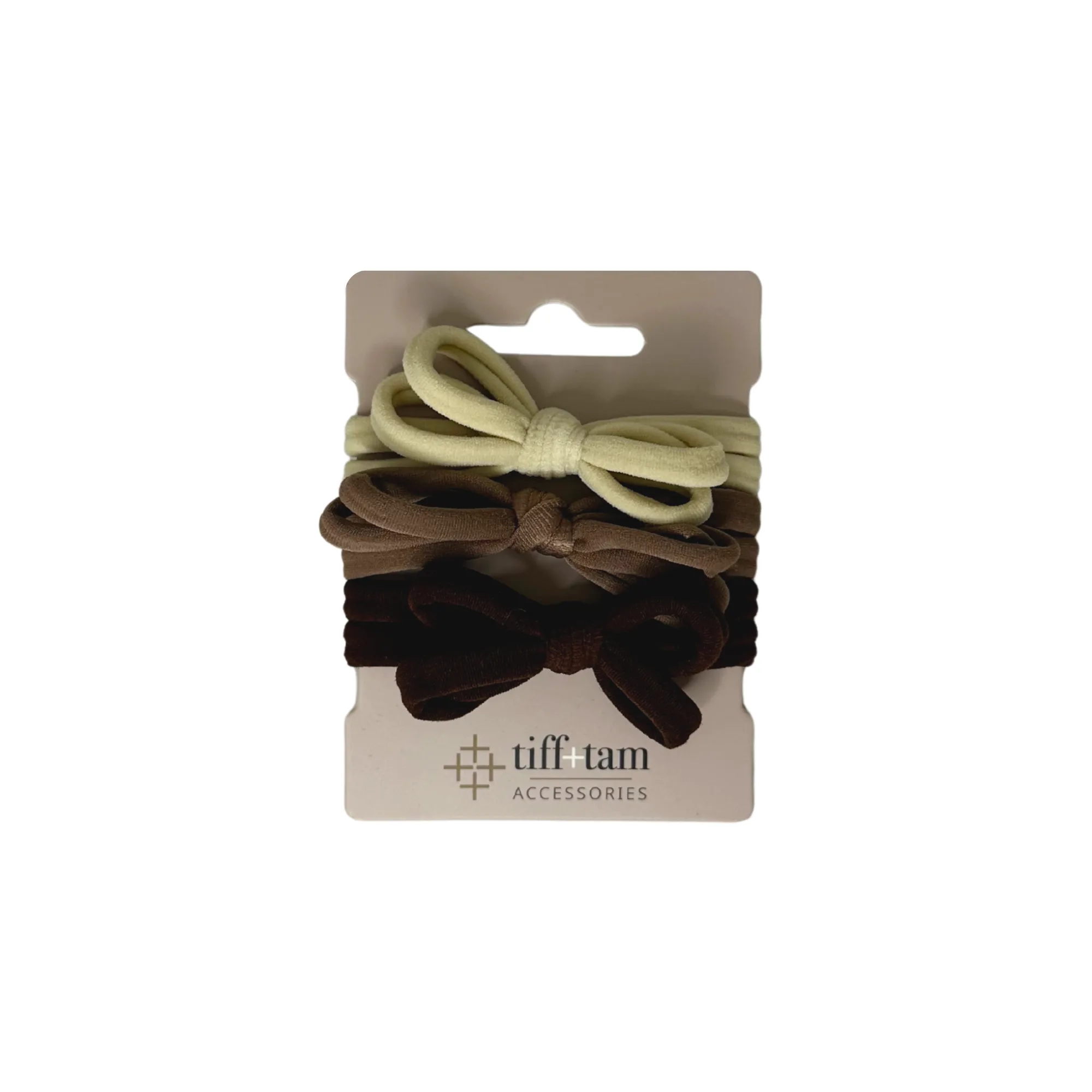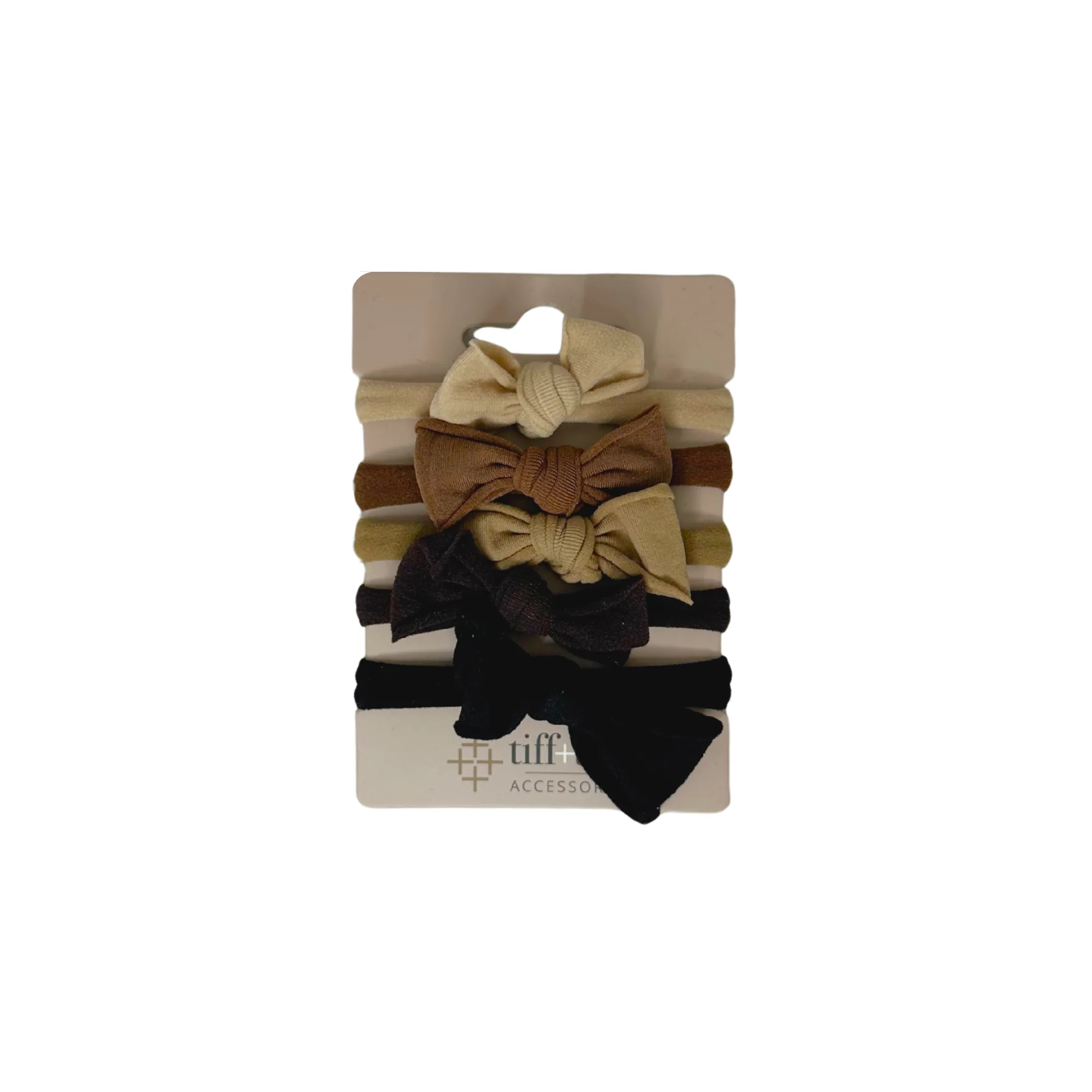 - Fabric Bow Hair Ties – Earth Tone Pack – Another elegant bow set featuring beige, yellow-tan, brown, and black tones, ideal for seasonal styling or everyday wear.