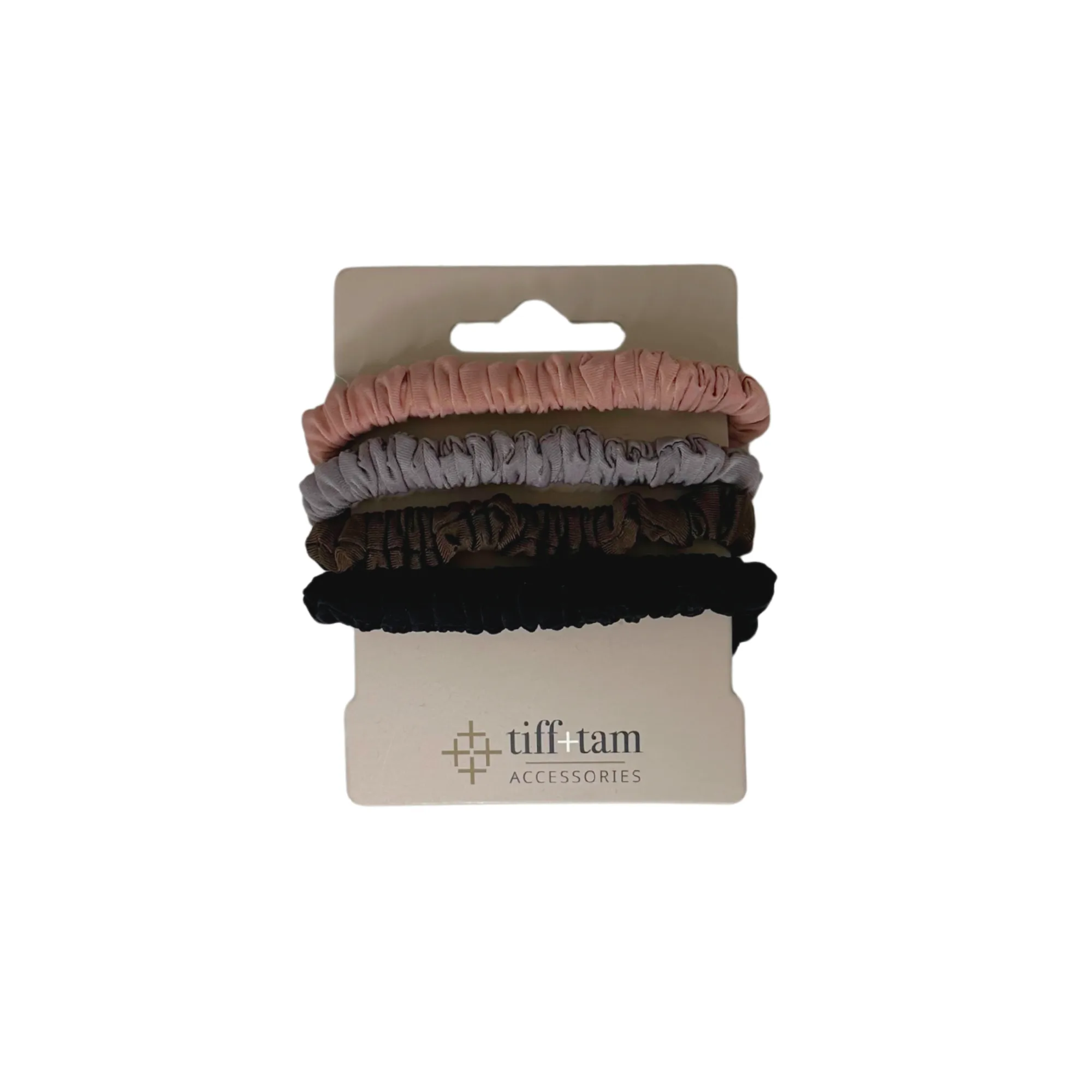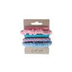 - Satin + Fabric Hair Ties – Pastel Mix Pack – Includes satin skinny scrunchies and fabric ponytail holders in soft pinks and blues — a gentle pop of color that complements the neutral theme.