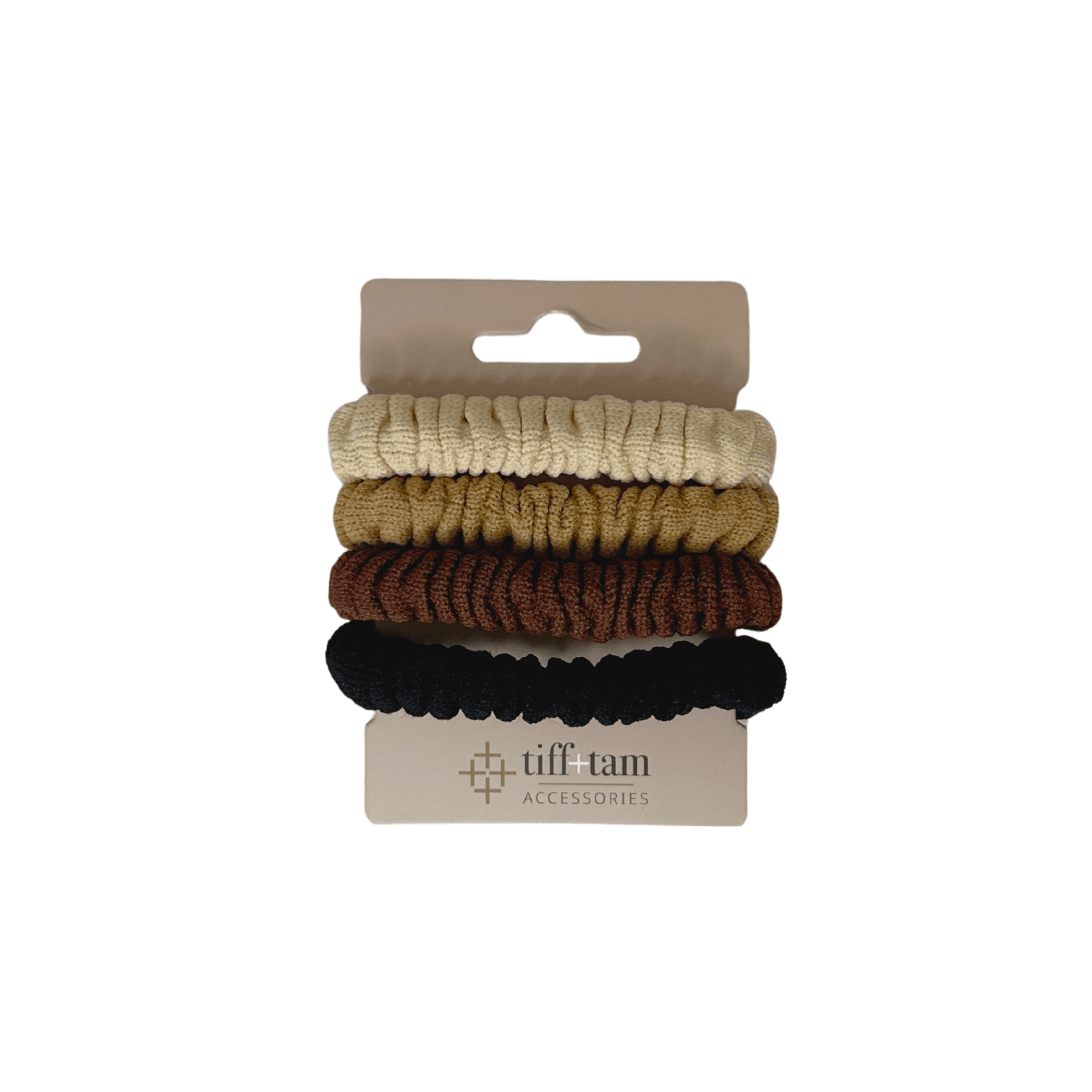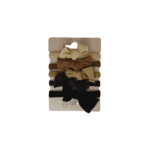 - Thicker Scrunchie-Hybrid Hair Ties – Soft Stretch – Slightly fuller in volume for added style and comfort. Includes light yellow beige, tan, brown, and black for a natural palette.