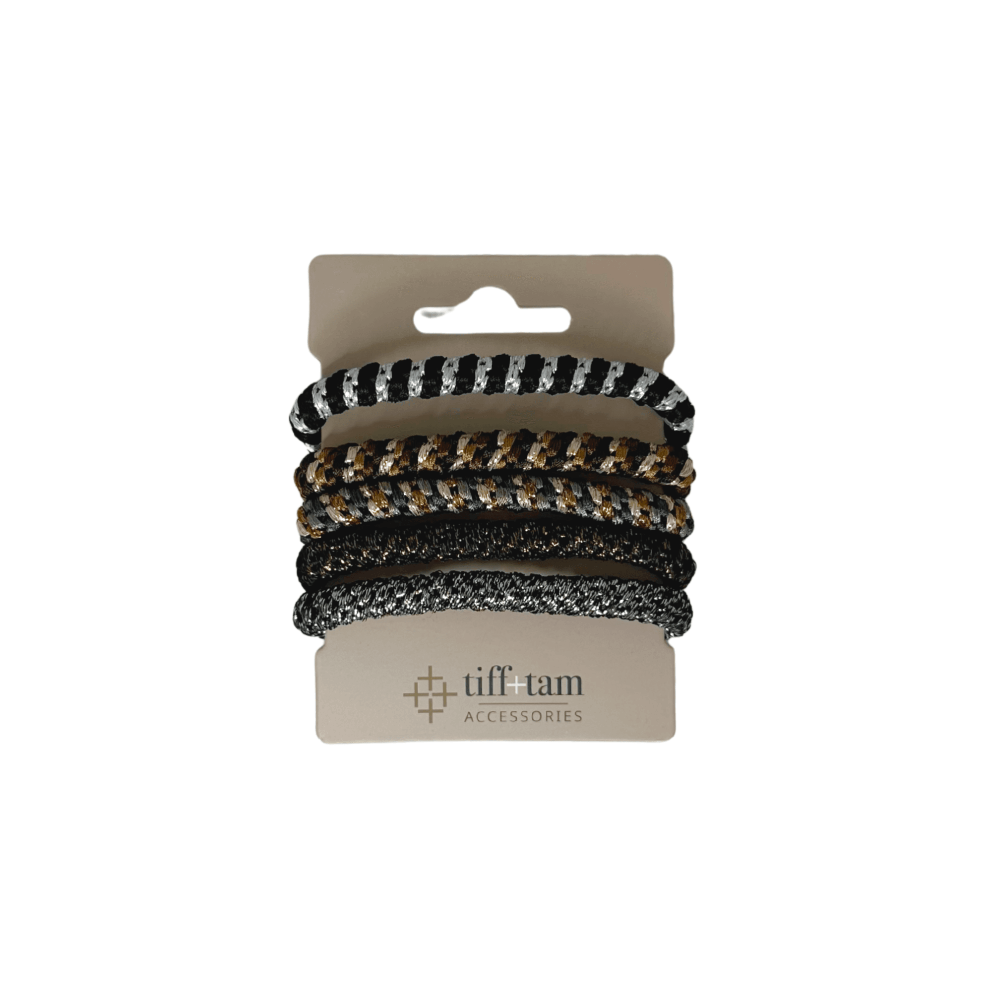 - Mixed-Texture Hair Ties – Neutral Pattern Pack – An eclectic mix of patterns and fabrics in a brown/black family, offering visual interest and variety while staying understated.