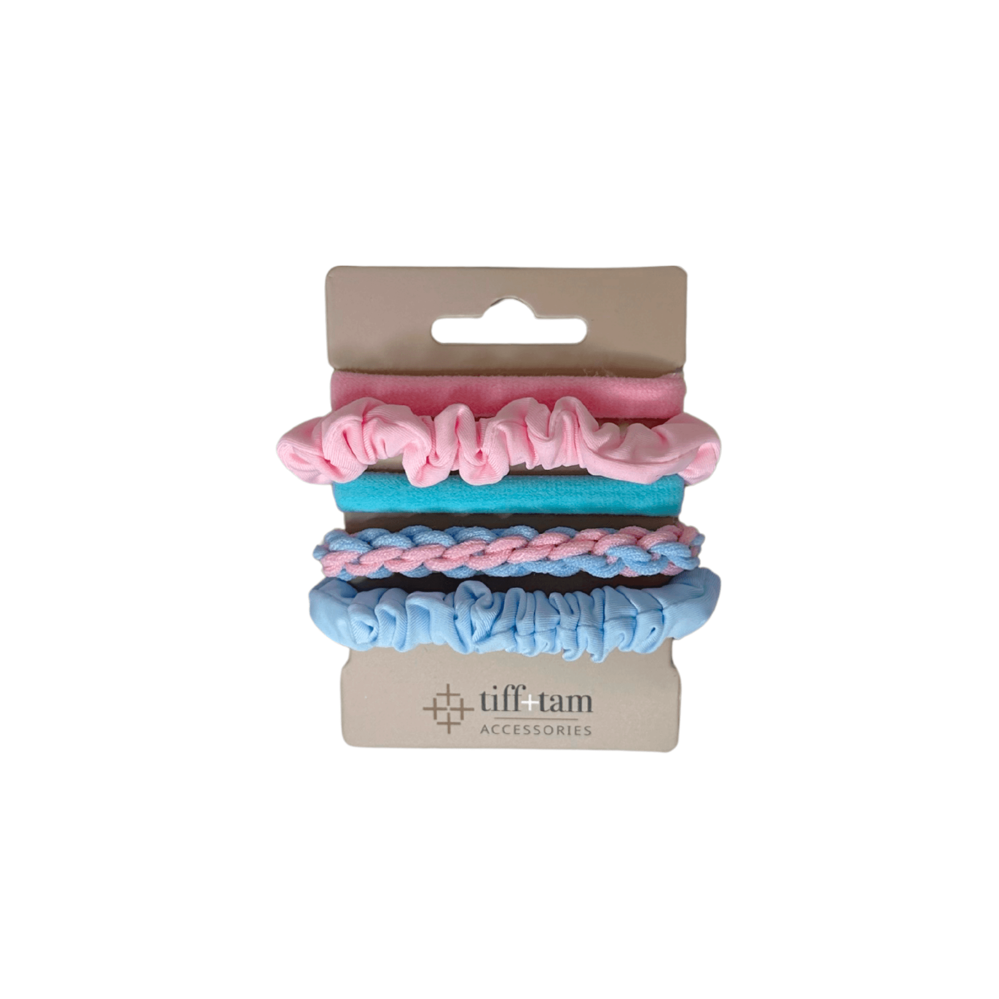 - Satin + Fabric Hair Ties – Pastel Mix Pack – Includes satin skinny scrunchies and fabric ponytail holders in soft pinks and blues — a gentle pop of color that complements the neutral theme.