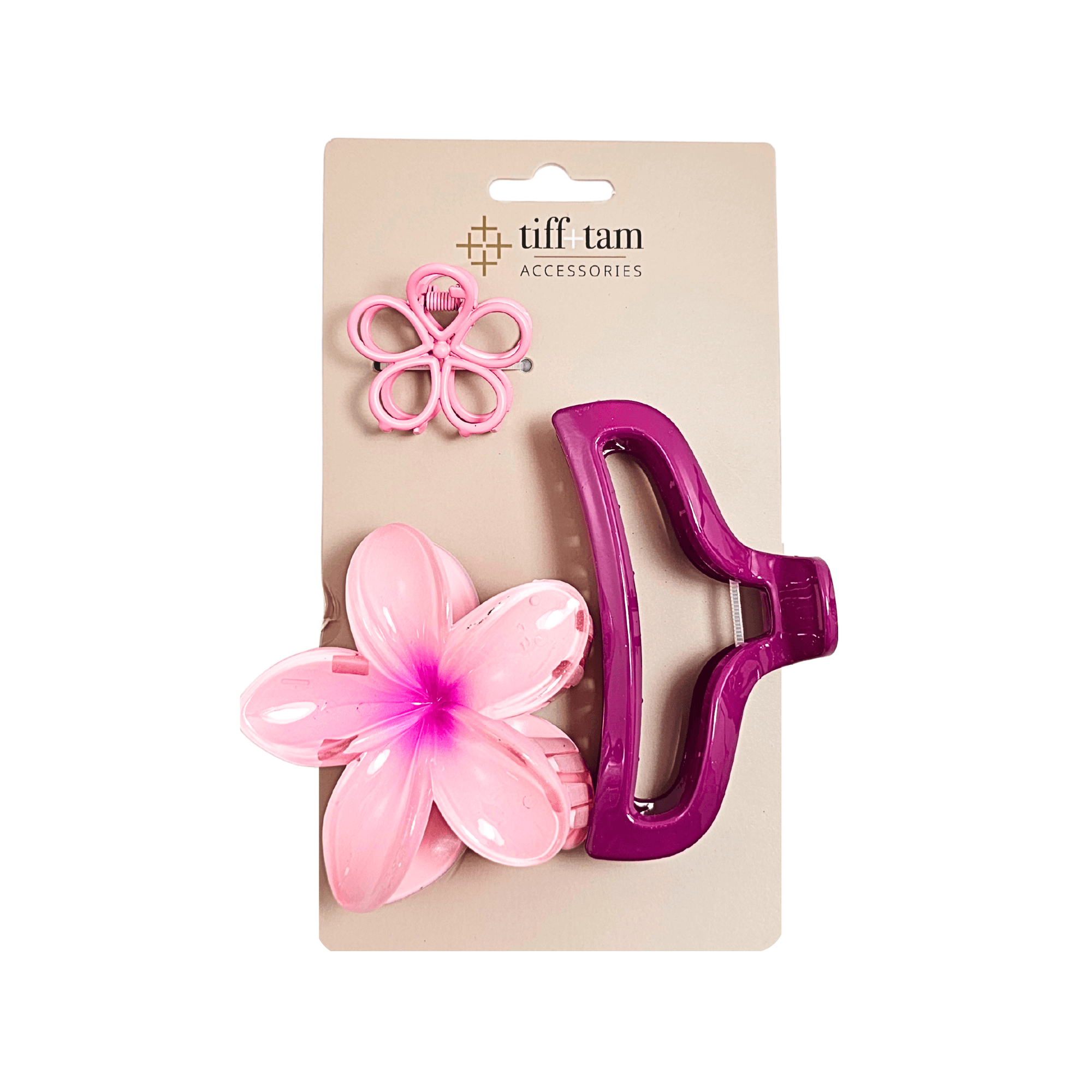 This 3-piece claw clip set from tiff+tam Accessories features a playful mix of styles including floral designs and modern claw clips in pink tones. Lightweight yet durable, these clips provide a secure hold for quick updos, half-up styles, and effortless everyday styling.