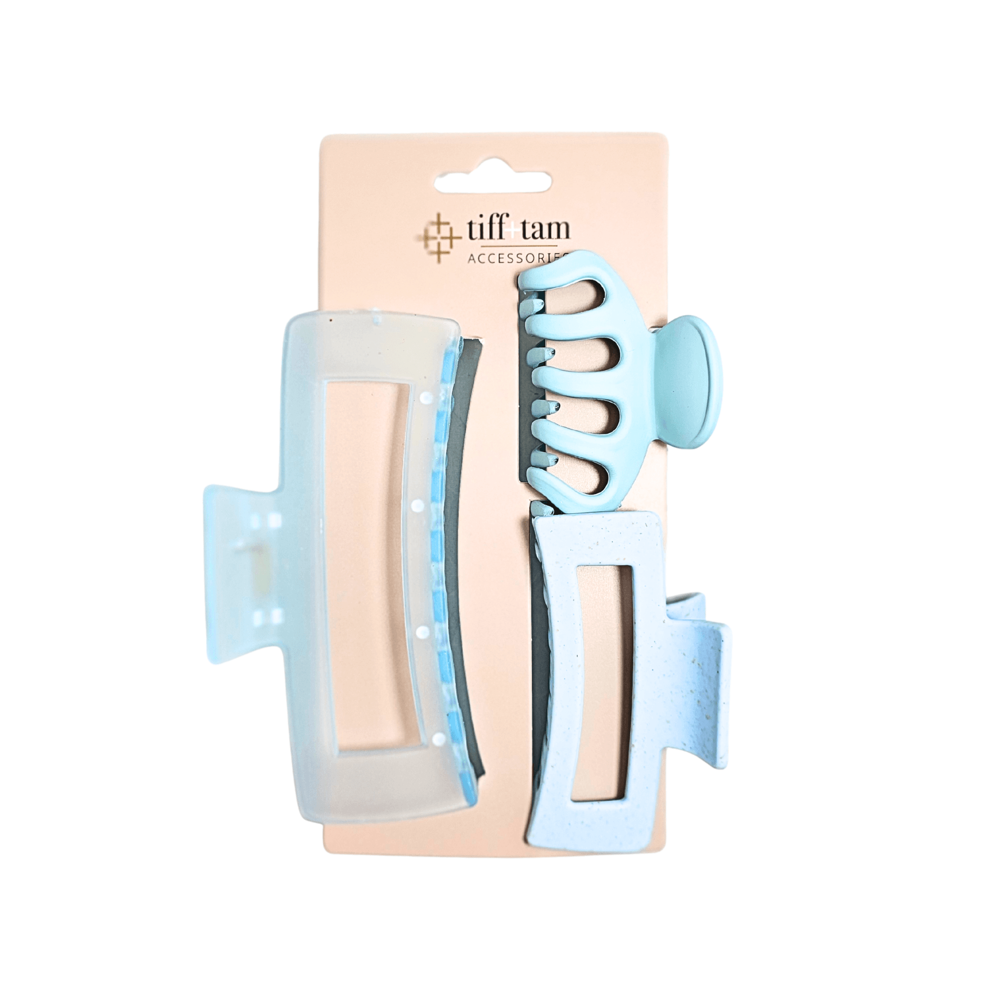 This 3-piece jaw clip set from tiff+tam Accessories features coordinating clips in soft sky blue tones with a mix of modern shapes for versatile everyday styling. Designed with durable spring hinges for a secure hold, these lightweight claw clips are perfect for quick updos, half-up styles, and effortless hair looks.