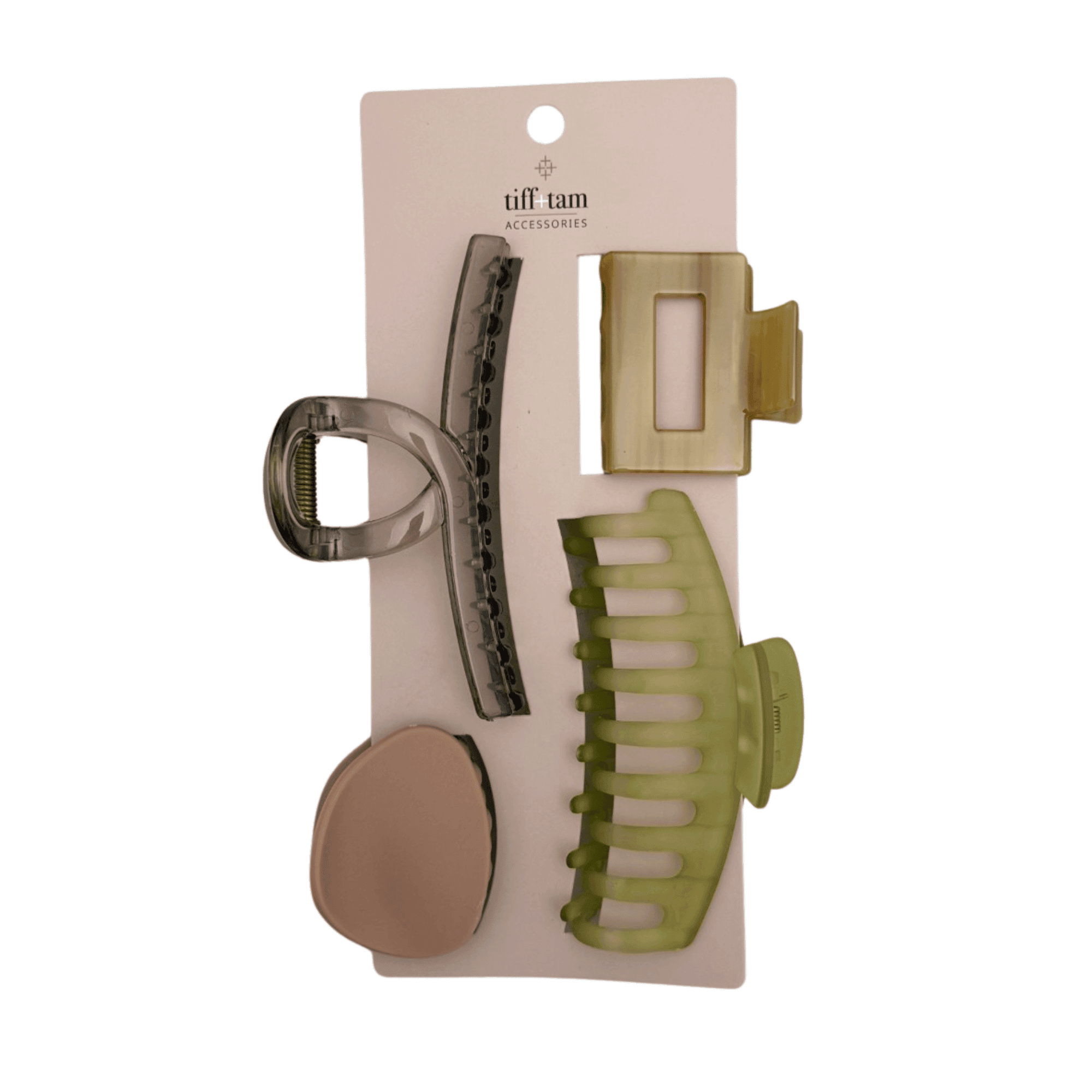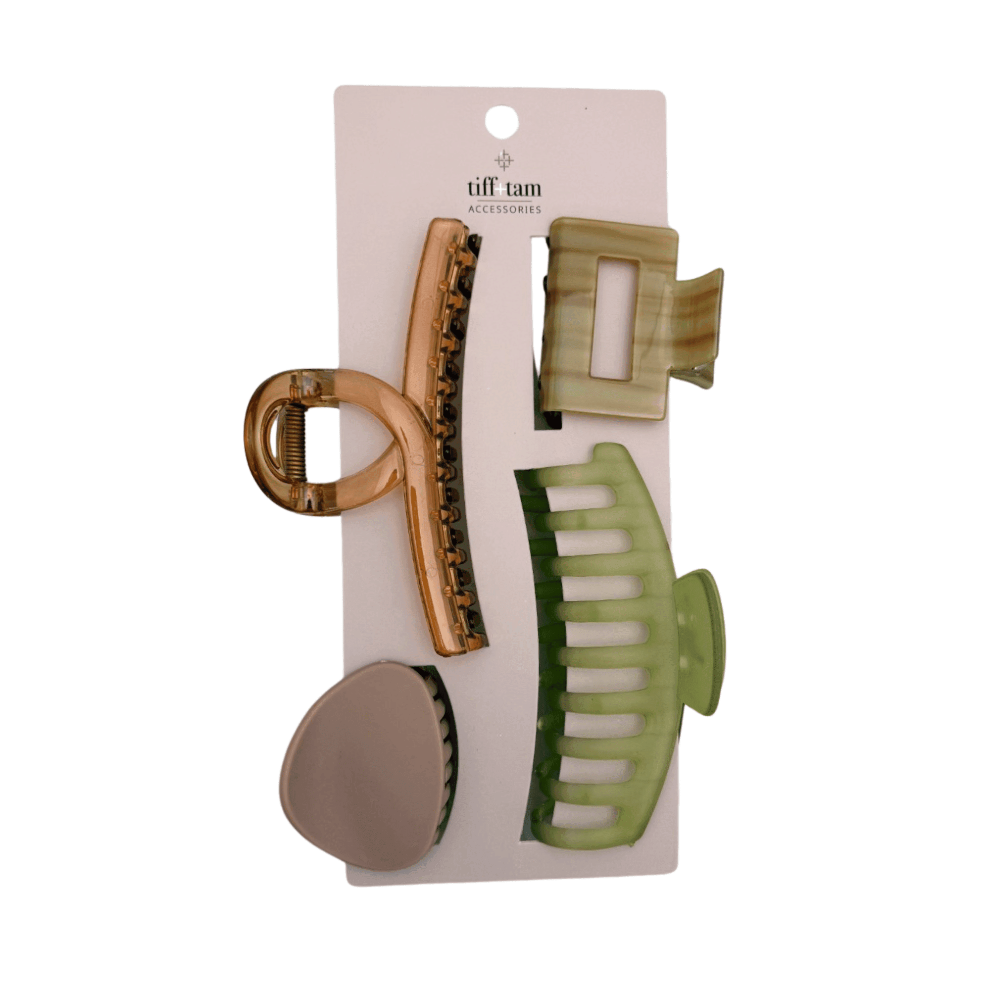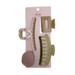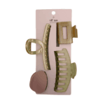 This assortment includes a dozen mixed hair claw clips in an “Olive Grove” color story, featuring soft greens and warm neutrals. Designed in a variety of modern shapes, including wide comb styles, sleek rectangular clips, and curved silhouettes, each piece offers a secure, comfortable hold with an elevated, everyday feel.