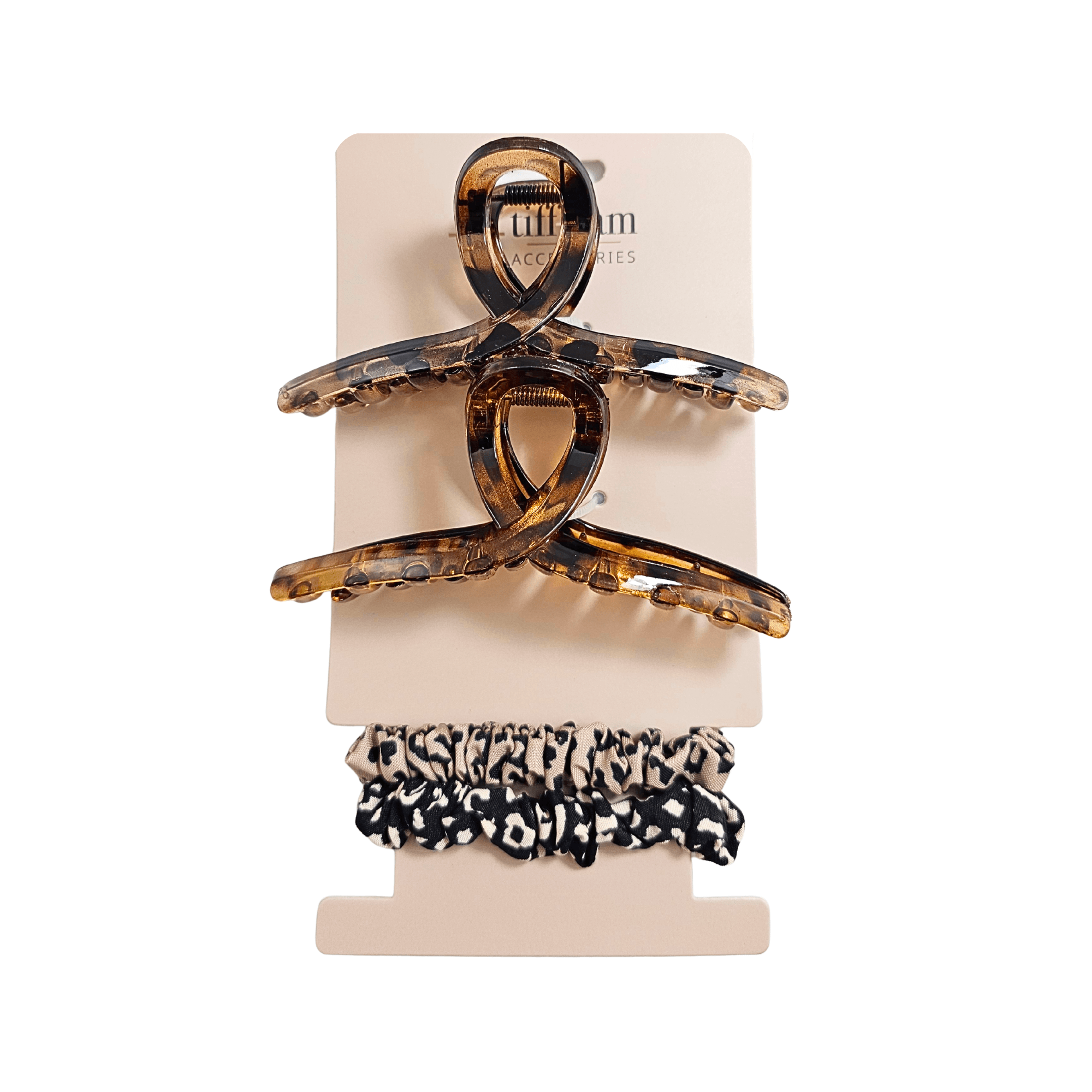 This set includes designer jaw clips and Pony O hair ties in an animal twist color story assortment featuring tortoiseshell and mixed animal-inspired prints. The statement claw clips provide a secure hold with a modern silhouette, while the coordinating elastics offer flexible, comfortable styling.
