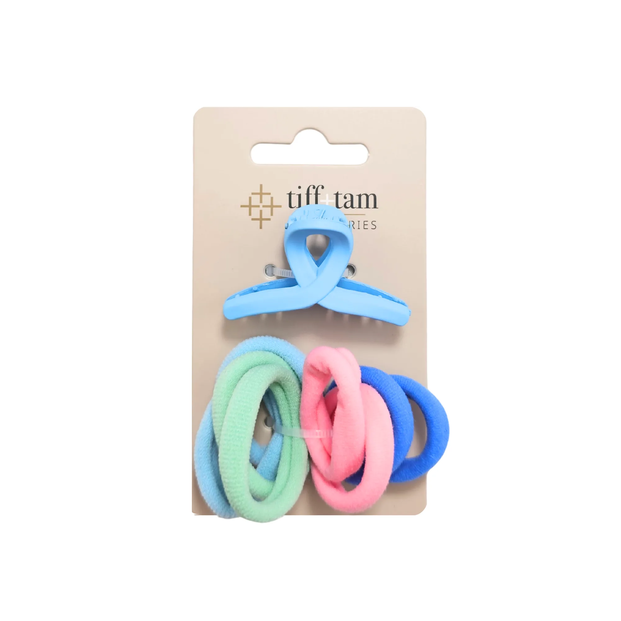 This hair accessory set from tiff+tam Accessories includes a mini twist-style jaw clip paired with soft pony O hair ties in bright pastel colors. Lightweight and versatile, these accessories are perfect for quick ponytails, securing small sections, and effortless everyday styling.
