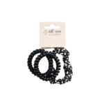 This set includes hair ties in a black assortment featuring a mix of telecord spiral styles and leopard crunchie design. Designed for versatility, these ties combine flexible coil construction with soft fabric texture for a secure, comfortable hold.