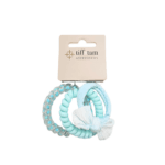 This set includes hair ties in a teal color assortment featuring a mix of soft elastics and telecord spiral styles. Designed for versatility, these ties offer a secure, comfortable hold with both smooth stretch and flexible coil construction.