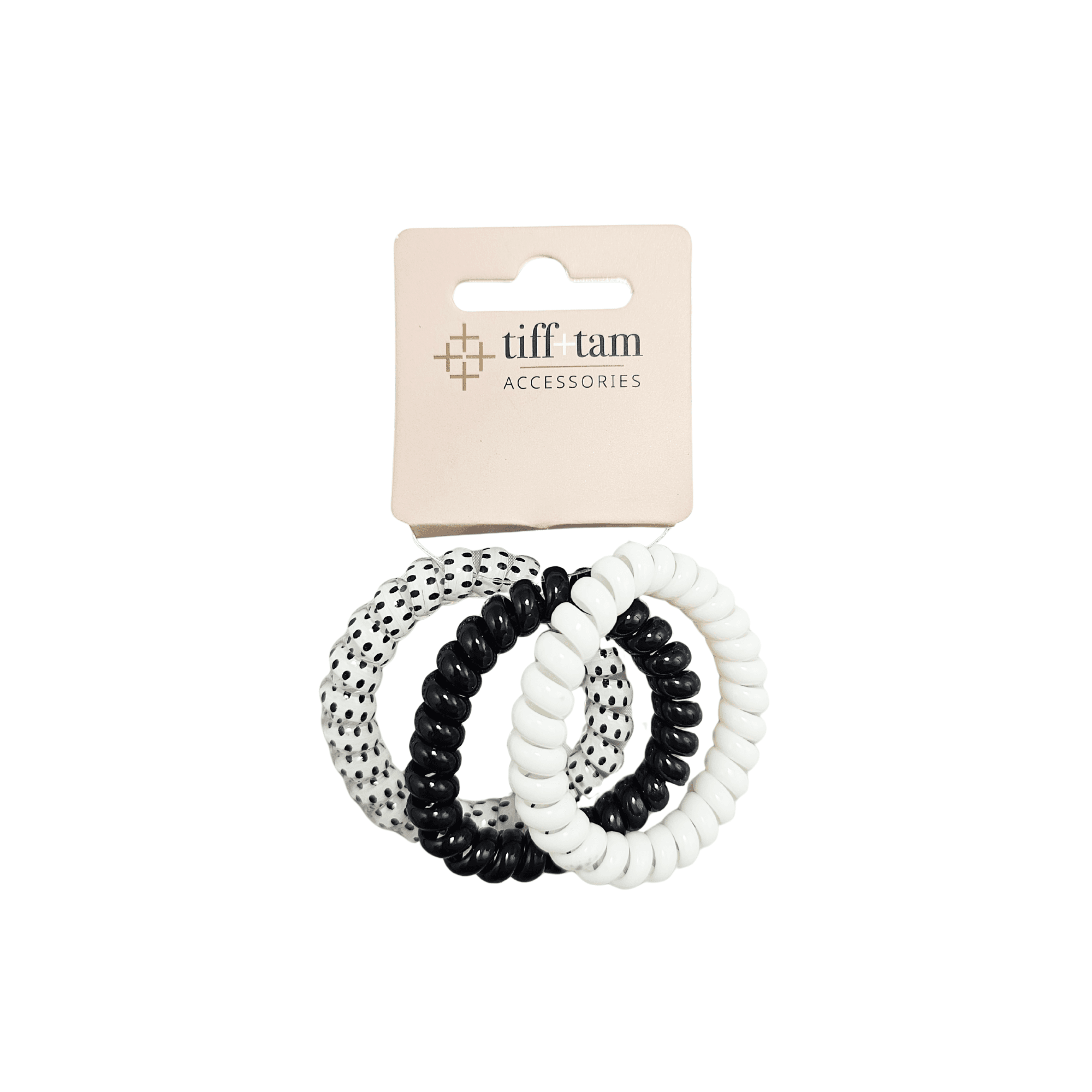 This set includes telecord hair ties in a chic assortment featuring a polka dot detail. The flexible coil design provides a secure, comfortable hold for everyday styling.