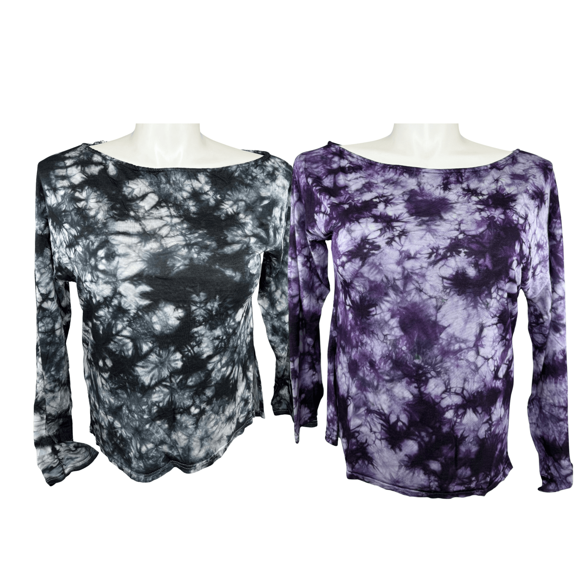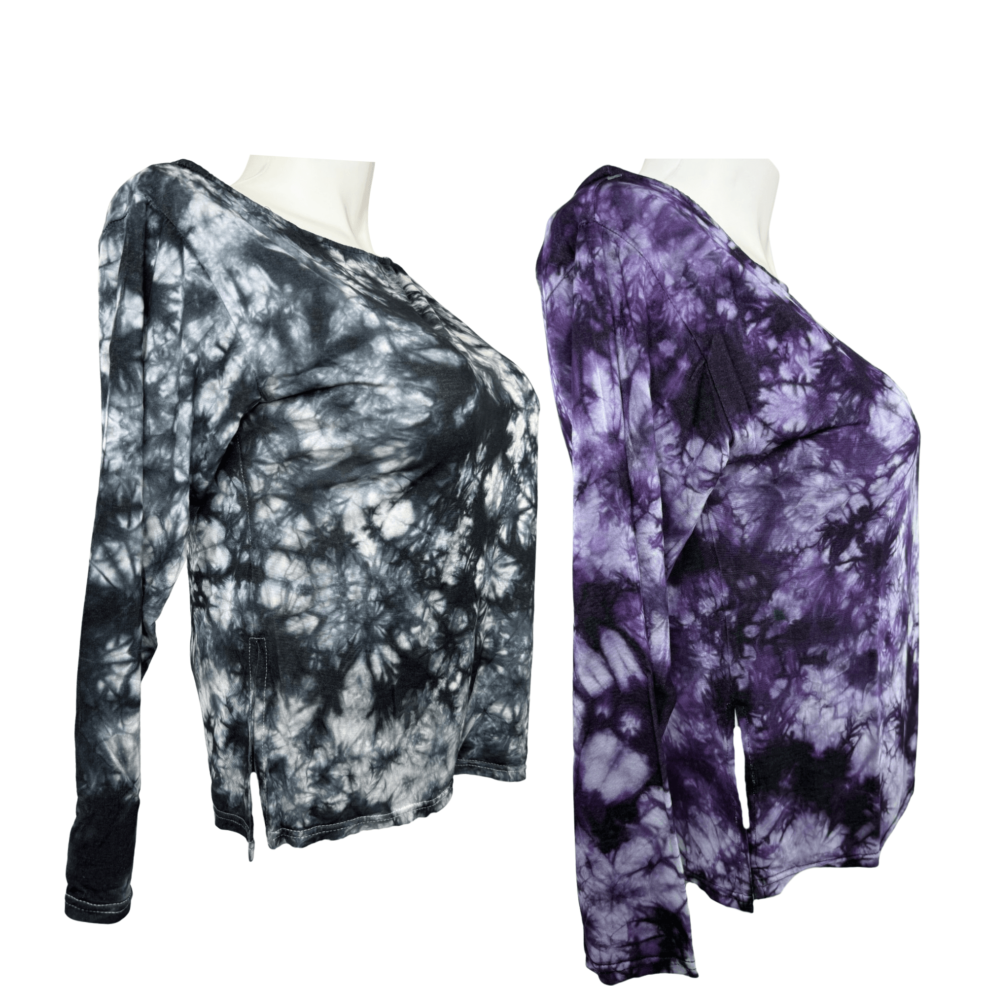 Ladies fashion workout cover-up top designed with a lightweight, flexible feel for comfortable layering. Features thumb holes at each sleeve and a side slit for added movement and an easy, flattering fit. Finished in tie-dye patterns and available in two colors, black and purple. Offered in sizes S/M and L/XL.